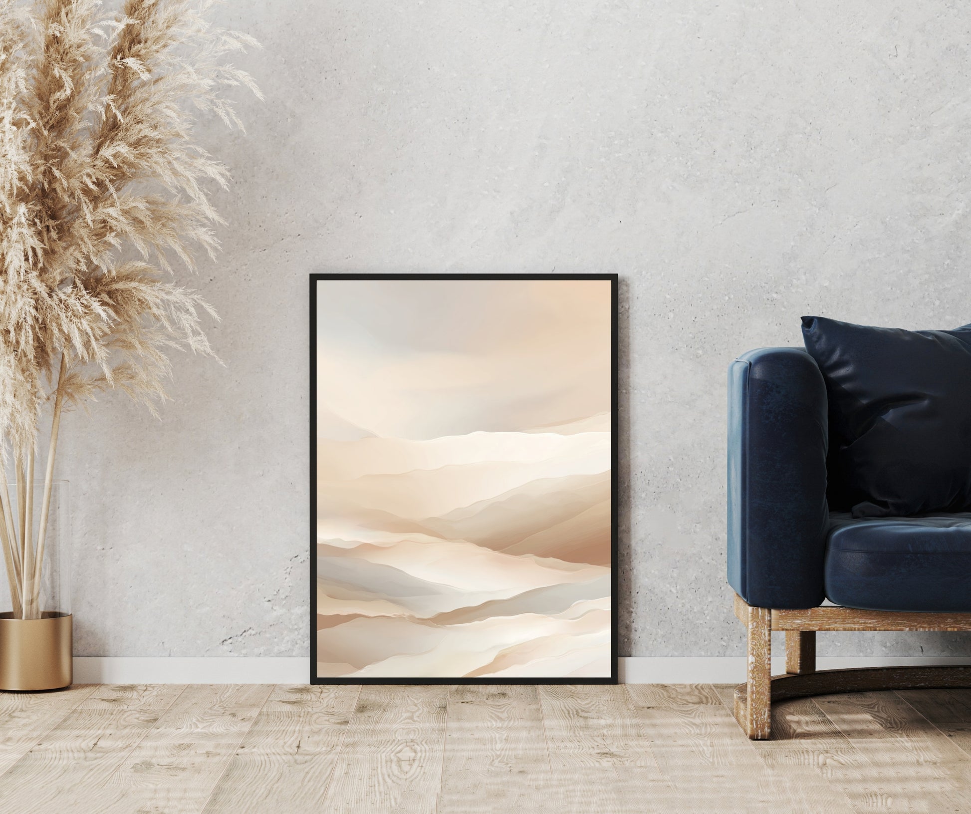 Aura Luminis entfaltet eine Landschaft, die nicht gemalt, sondern geflüstert scheint. Weiche Schichten aus Elfenbein, Sand und warmem Beige gleiten ineinander wie Nebel über Hügeln. Jede Linie ist sanft, jedes Detail gedämpft — und doch entsteht eine Weite, die den Raum atmen lässt.